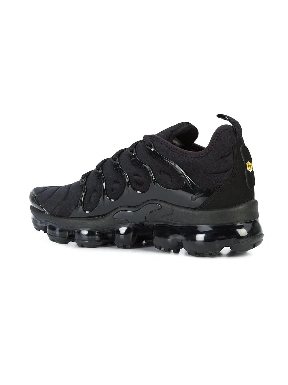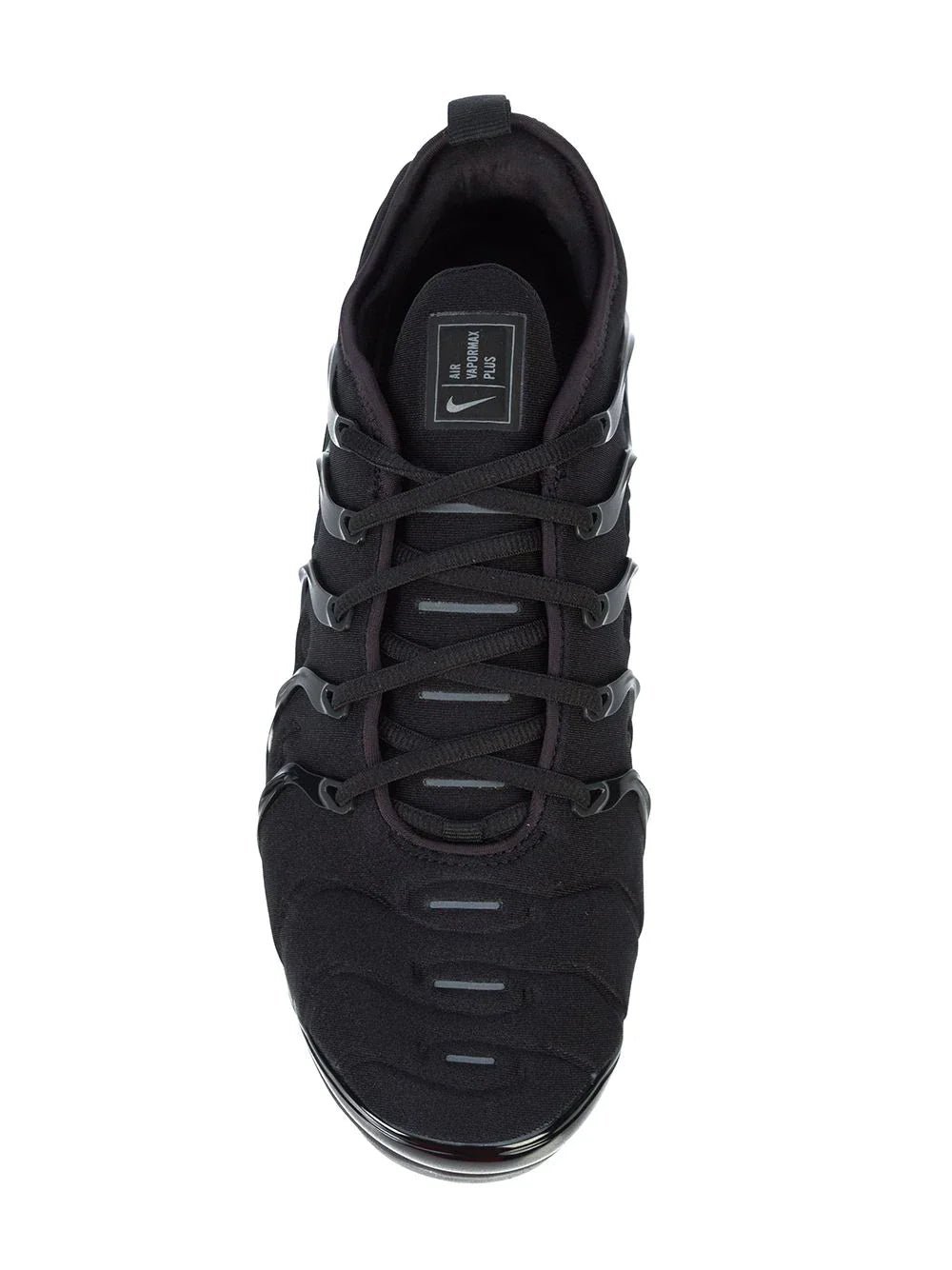 Black cotton Air VaporMax Plus lace-up sneakers from Nike featuring a logo patch at the tongue, a round toe, a lace-up front fastening and a ridged rubber sole. Please note this item is unisex and sold in men’s sizing.