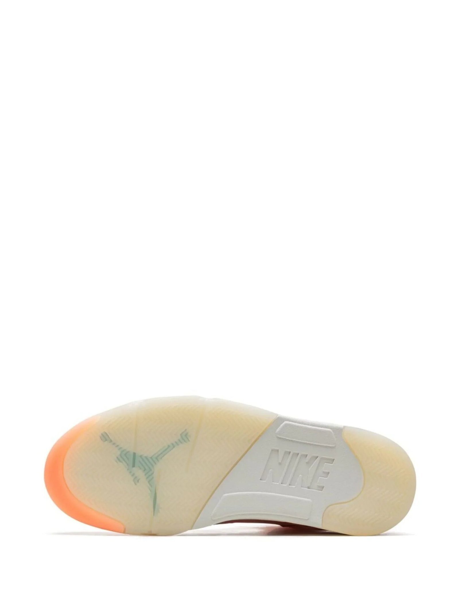 The DJ Khaled x Air Jordan 5 Retro is part of his “We the Best” collection. In this model, the upper appears in vibrant coral-hued leather contrasted with a silky quilted lining in Leche Blue, with the heel overlays adorned with a blue embroidered Nike Air logo on the right and ‘We the Best’ on the left. Underneath, an off-white polyurethane midsole with blue-speckled shark-tooth detailing and a translucent rubber outsole complete the look.