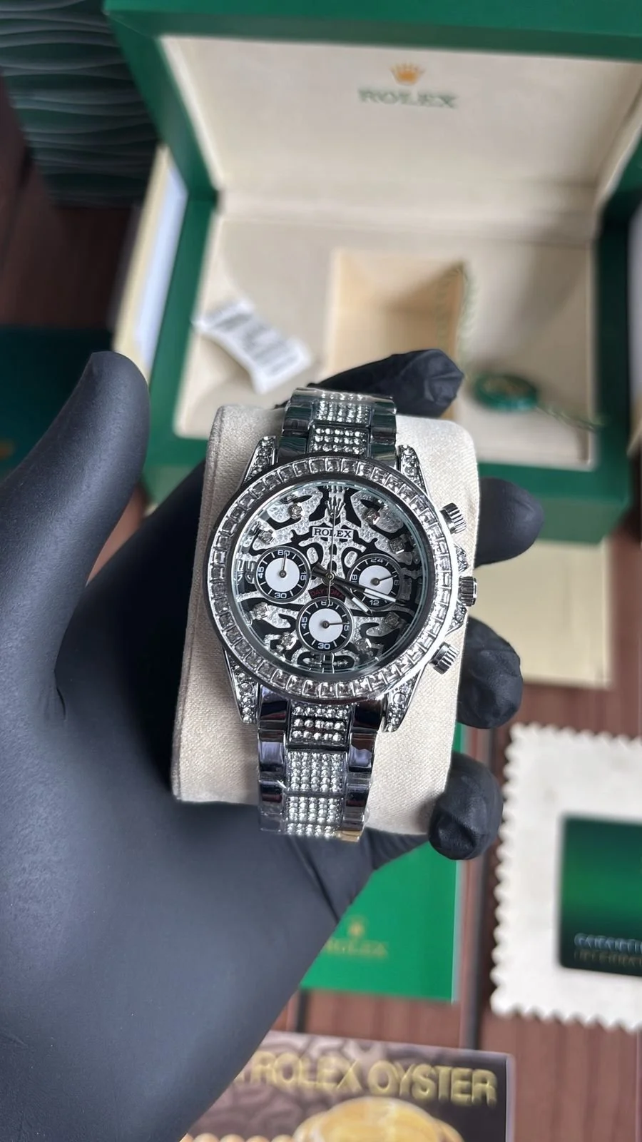 The Rolex Daytona “Eye of the Tiger” features a mesmerizing tiger-patterned diamond dial, gold case, and diamond-encrusted bezel. This masterpiece combines bold design with Rolex’s signature precision and luxury craftsmanship.